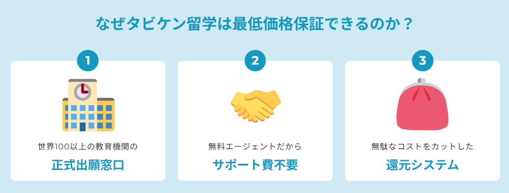 費用をとにかく抑えたいのであれば、タビケン留学が一番おすすめです。