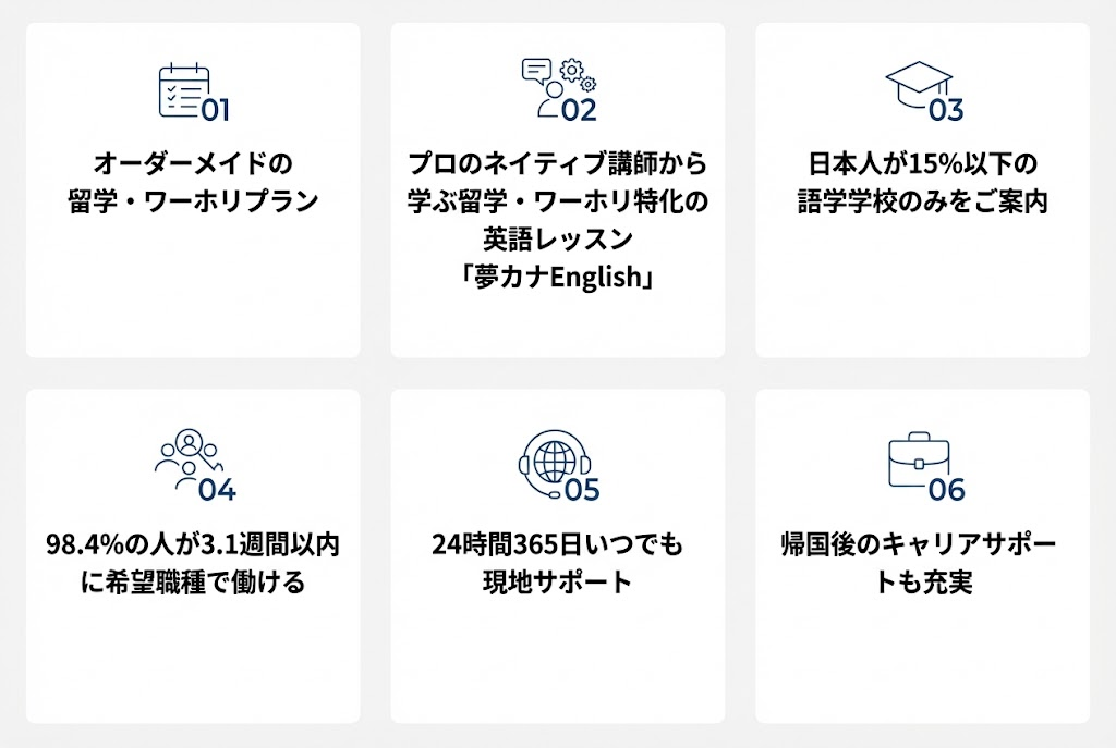 などなど、夢カナでは「ワーホリだけ」ではなく、あなたの今後の人生のサポートまで出がけています。